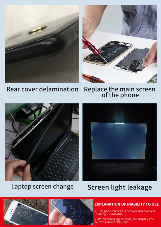 This glue is particularly suitable for repairing smartphones and tablets, where components such as screens, cameras, or speakers need to be attached. Thanks to its transparent formula, the end result remains neat and invisible. The glue is also water-resistant, ensuring durable adhesion.