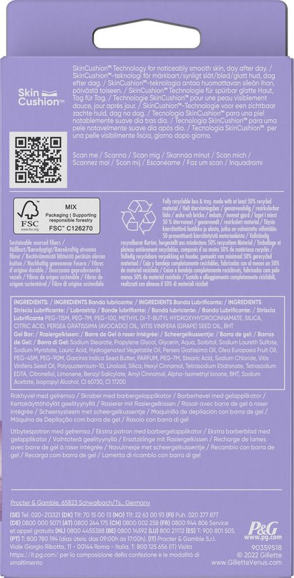 De gelkussentjes geven tijdens het scheren lichaamsboter af met de frisse geur van witte thee. Dit zorgt voor extra glijvermogen en comfort. De Venus SkinCushion-technologie biedt 50% meer bescherming tegen scheerirritatie vergeleken met een Lubrastrip zonder SkinCushion.