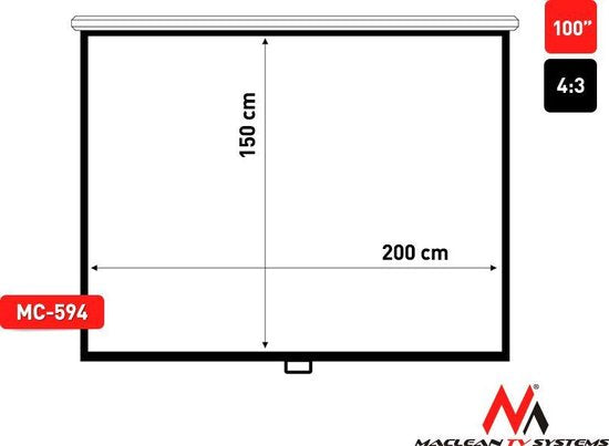 The Maclean MC-594 projection screen delivers a clear image with true-to-life colors for professional presentations and home cinema. The 4:3 format with a 100-inch diagonal (200×150 cm) is ideal for PowerPoint presentations, movies, and gaming.