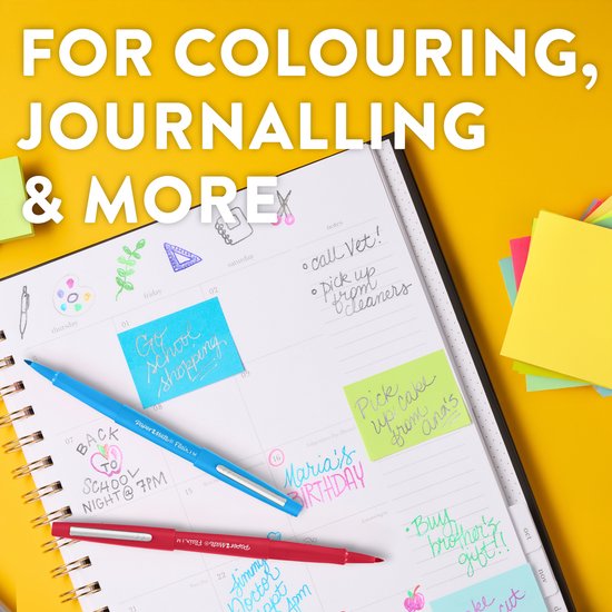 Paper Mate Flair viltstiften zijn klassieke viltstiften met een medium 0,7 mm punt voor expressieve lijnen. De veegvaste inkt op waterbasis vloeit niet door het papier heen.