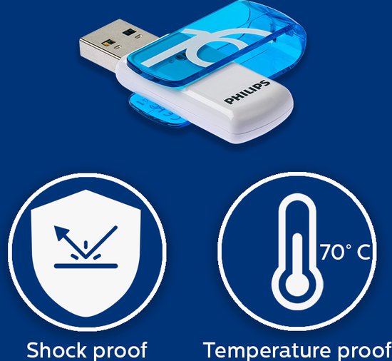 Philips Vivid Edition USB stick with 16 GB storage capacity for daily use. This ocean blue USB 2.0 stick offers read speeds of up to 80 Mbps with a user-friendly swivel design.