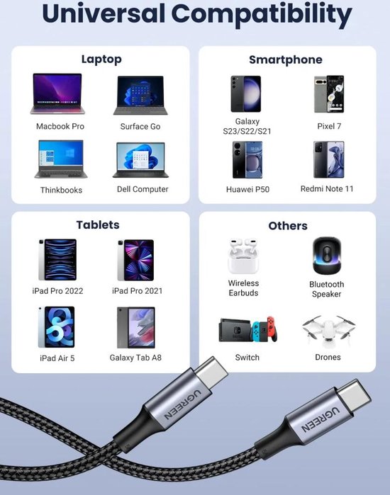 This Ugreen USB-C cable supports fast charging up to 100W and is designed for versatile use. With USB-C Male connectors on both ends, the cable is suitable for modern devices such as MacBooks, iPads, smartphones, and tablets.