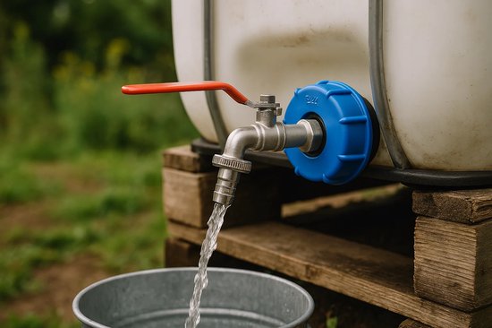 IBC adapter set voor professionele watertoevoer met S60×6 aansluiting en 3/4" kraan. Complete set met adapters en afdichting voor lekvrije installatie op IBC-containers.