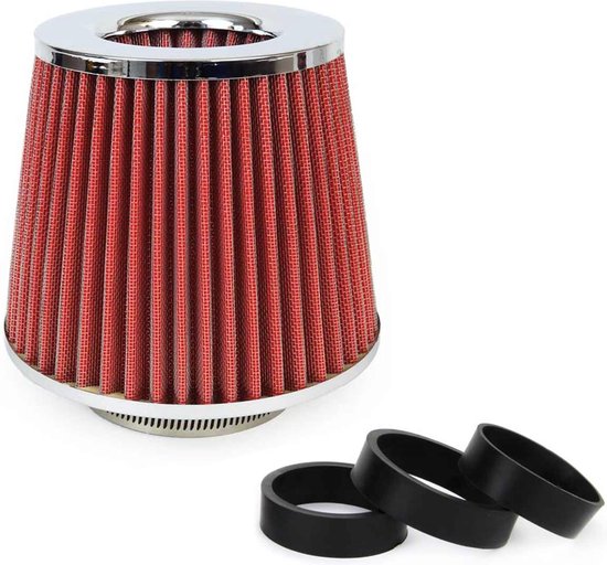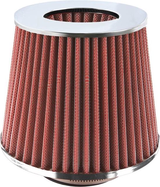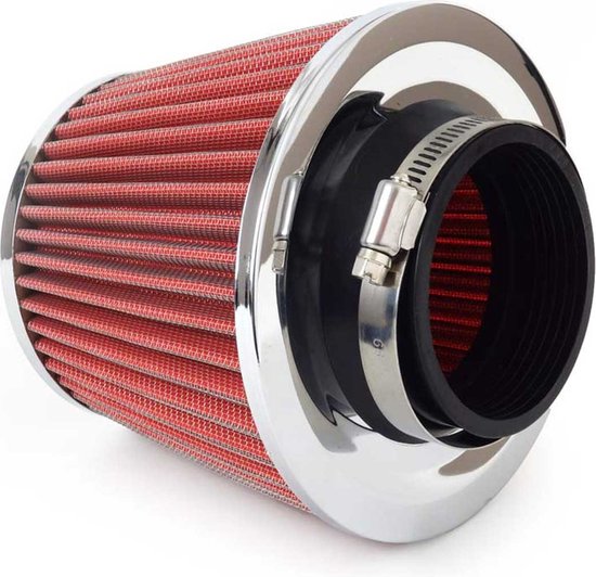 Universele powerfilter voor een sportieve uitstraling en verbeterde luchttoevoer. Deze kegelvormige luchtfilter van AMiO heeft een opvallende rode en chrome afwerking en is geschikt voor de meeste auto's.