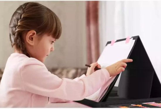 Ja, dat kan. Wanneer je de koffer volledig openklapt ontstaat een dubbele A4 tekenruimte. Je kunt twee kinderen tegenover elkaar laten zitten, zodat ze allebei hun eigen werkplek hebben.