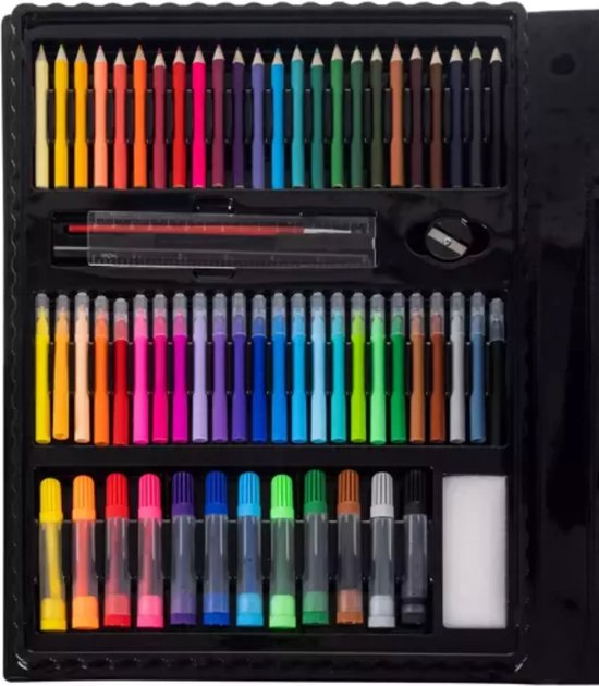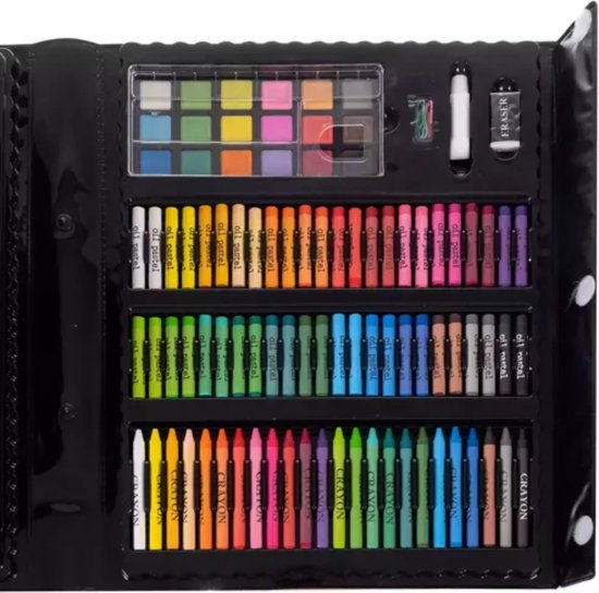 Deze veelzijdige set bevat dikke stiften, kleurpotloden, krijtjes, oliepastels, waterverf en penselen. Geschikt voor kinderen vanaf 3 jaar, maar ook volwassenen kunnen hun hart ophalen met deze uitgebreide collectie tekenmateriaal. De set is gemaakt van duurzaam kunststof en ideaal voor creatieve projecten thuis, op school of onderweg.